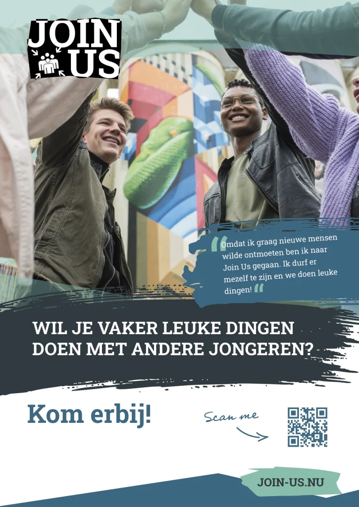 Join Us is een organisatie die jongeren tussen de 12 en 30 jaar helpt om eenzaamheid te overwinnen door hen in contact te brengen met leeftijdsgenoten en hen te ondersteunen bij het versterken van hun sociale vaardigheden.