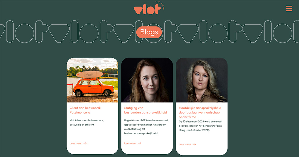 Krumps werd benaderd door Patricia en Moniek van Vlot Advocaten, die op zoek waren naar een bureau om hun visie om te zetten in een sterke branding en online aanwezigheid. Na kennismaking via LinkedIn hebben we nauw samengewerkt om een huisstijl en website te ontwikkelen die hun professionele identiteit weerspiegelen. Deze samenwerking heeft geleid tot een consistente en aantrekkelijke uitstraling die aansluit bij hun juridische expertise en ondernemende spirit.